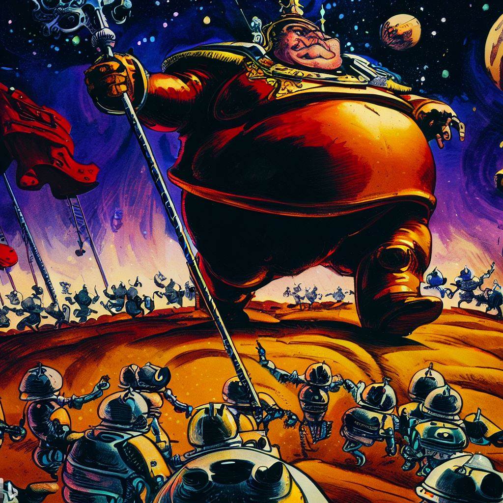 Spiko led his robots through the stars, Conquering space and worlds with power unmatched, His enemies trembled at his feet in fear, As he and his army of robots advanced.