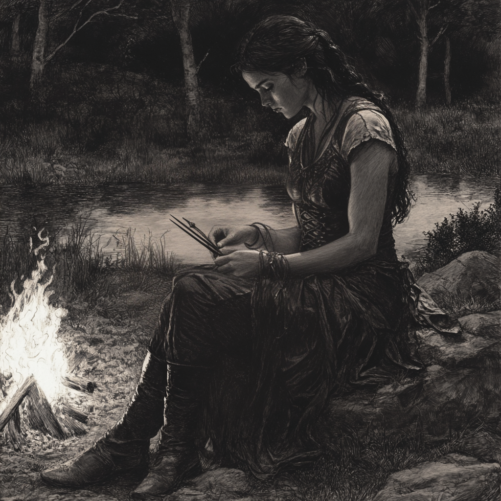 Lirael agreed, swiftly gathering dry twigs from the prairie’s edge. With deft hands, she struck flint to spark a fire, its glow rivaling Korath’s hue. I watched, awed, as she mended a tear in my cloak, her needle weaving hide with practiced ease. “You’re indispensable, Lirael,” I said. “Fixing, mending—skills we’ll need in the wilds.”